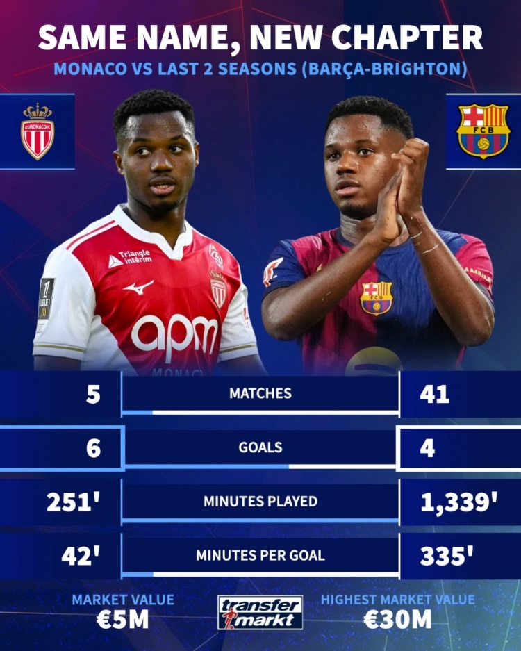 • 焕发新生!法蒂过去两个赛季41场打进4球,本赛季在摩纳哥5场6球